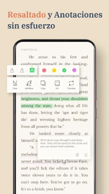 La experiencia con BooxReader va más allá de la simple visualización. Sumérgete en un entorno de lectura puro, libre de interrupciones y con la tranquilidad de que tu privacidad es nuestra prioridad; no rastreamos tus hábitos, y todos tus contenidos permanecen resguardados localmente. Personaliza tu lectura para el máximo confort visual con el Modo Oscuro, temas como Papel Vintage o Verde Cuidado Ocular, y ajusta cada detalle: tamaño de fuente, estilo, interlineado y márgenes. Además, con sus herramientas de estudio y trabajo, BooxReader te permite organizar inteligentemente tu colección, añadir notas y resaltar pasajes importantes, transformando tu dispositivo en una potente estación de estudio o análisis.