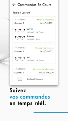 Con Lunettes Pour Tous, la conveniencia se extiende hasta la entrega. Decida si desea recibir sus flamantes gafas directamente en la puerta de su casa o si prefiere recogerlas personalmente en la tienda Lunettes Pour Tous que le resulte más conveniente. Además, la tranquilidad está asegurada con nuestro sistema de seguimiento en tiempo real, que le permite conocer la ubicación exacta de su pedido en cada etapa. Revise también su historial de compras pasadas, tanto las realizadas en nuestras sucursales físicas como a través de la aplicación Lunettes Pour Tous, para mantener un registro claro y accesible.